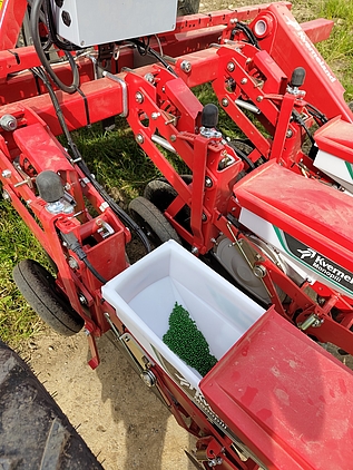 Am 30.05.2023 wurden die ersten Parzellen mit der Monopill gesät. Hierfür wurden zunächst vier verschiedene Bahnen ausgesät, mit jeweils unterschiedlichen Einstellungen an der Sämaschine. Die Reihenweite beträgt 45cm und in der Reihe wurde ein Pflanzenabstand von 25cm eingestellt.