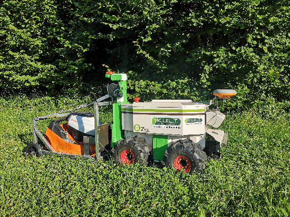 Im Jahr 2020 befinden sich die Bekämpfungsgeräte im Aufbau. Das fahrerlose Gerät baut auf dem Trägerfahrzeug Oz der Firma Naio auf, das einen Sichelmäher mit einer Arbeitsbreite von 0,40 m aufnimmt (Bild 1). Das Traktor gebundene Gerät wird im Frontkraftheber aufgenommen und hat 10 Schnittsektionen mit jeweils 0,25 m Arbeitsbreite. Beide Gerätetypen werden mit zentimetergenauem RTK-GNSS zur Positionsbestimmung im Feld und einer Steuerung ausgestattet, die in der Lage ist, Applikationskarten abzuarbeiten. Beide Geräte sollen im Frühjahr 2021 in befallenen Grünlandbeständen erprobt werden.
