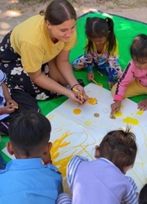 Hintergrund: Vier Kunsttherapiestudierende (B.A.) der HfWU haben in Kambodscha ein innovatives Projekt: Color Kaleidoscope: A Vibrant Journey for Children in Cambodia als künstlerische Feldforschung durchgeführt. Kinder und Jugendliche (2-12 Jahre) des Kinderzentrums Wat Opot waren die jungen Projektteilnehmer. Ihre Neugier, Begeisterung und Hingabe im gemeinsamen Gestalten sowie Entdecken des für sie unbekannten kreativen Materials war beeindruckend. Hier lohnt sich ein weiterführender künstlerisch-kreativer Austausch und bildbezogener Vergleich von Kinderzeichnungen aus Deutschland. Eine am internationalen Austausch interessierte Institution, ob Kindergarten oder Schule, wird aktuell gesucht.
