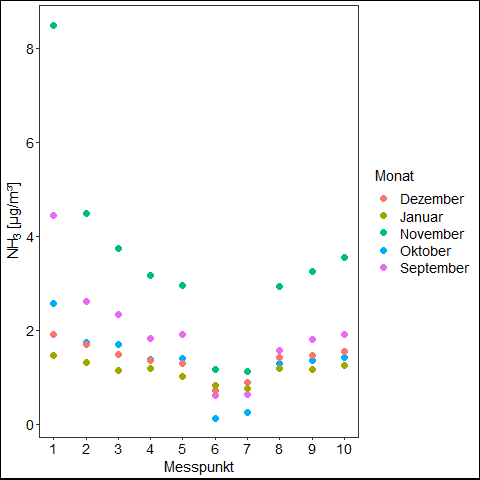 Der Luftammoniak weist ebenfalls eine Abnahme hin zum Hochmoor auf, im Moorwald sind die Werte am niedrigsten und in der Hochmoorebene steigen sie wieder leicht an. Die Ellenberg N-Werte der Vegetation deuten demnach auf einen abnehmenden Nährstoffgradienten vom Westrand des NSG Wurzacher Ried hin zum Hochmoorschild hin, während im Hochmoorschild kein solcher Gradient mehr ersichtlich ist. Dieser Nährstoffgradient könnte mit dem Luftammoniak zusammenhängen.