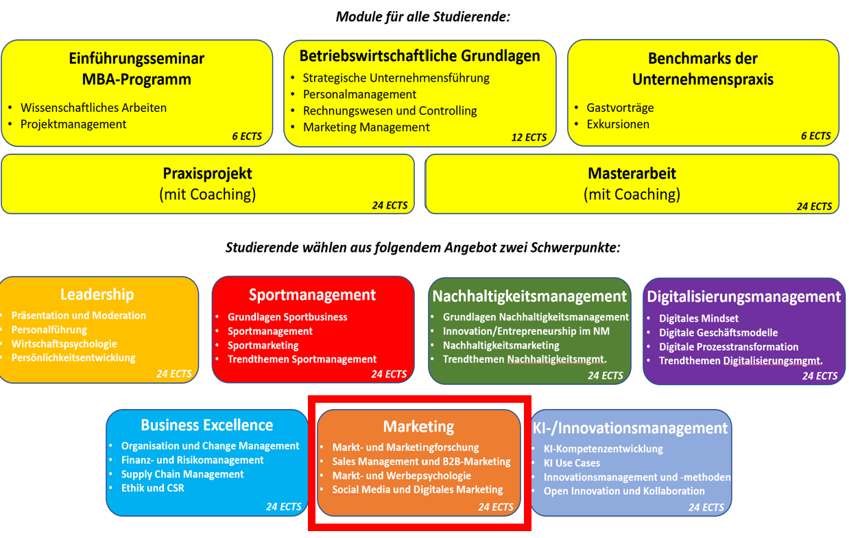 Im Schwerpunkt Marketing stehen vier Module mit insgesamt acht Vorlesungstagen auf dem Plan. Jedes Modul umfasst 6 ECTS.