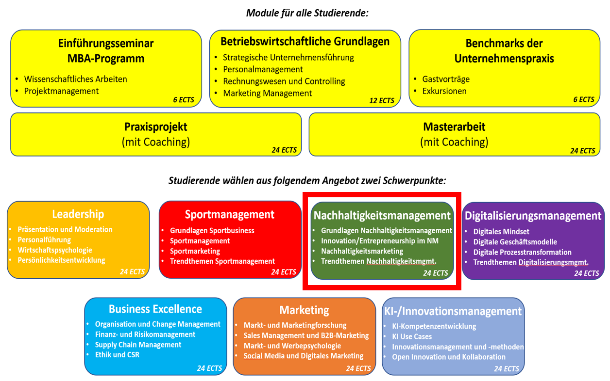 Im Schwerpunkt Nachhaltigkeitsmanagement stehen vier Module mit insgesamt acht Vorlesungstagen auf dem Plan. Jedes Modul umfasst 6 ECTS.