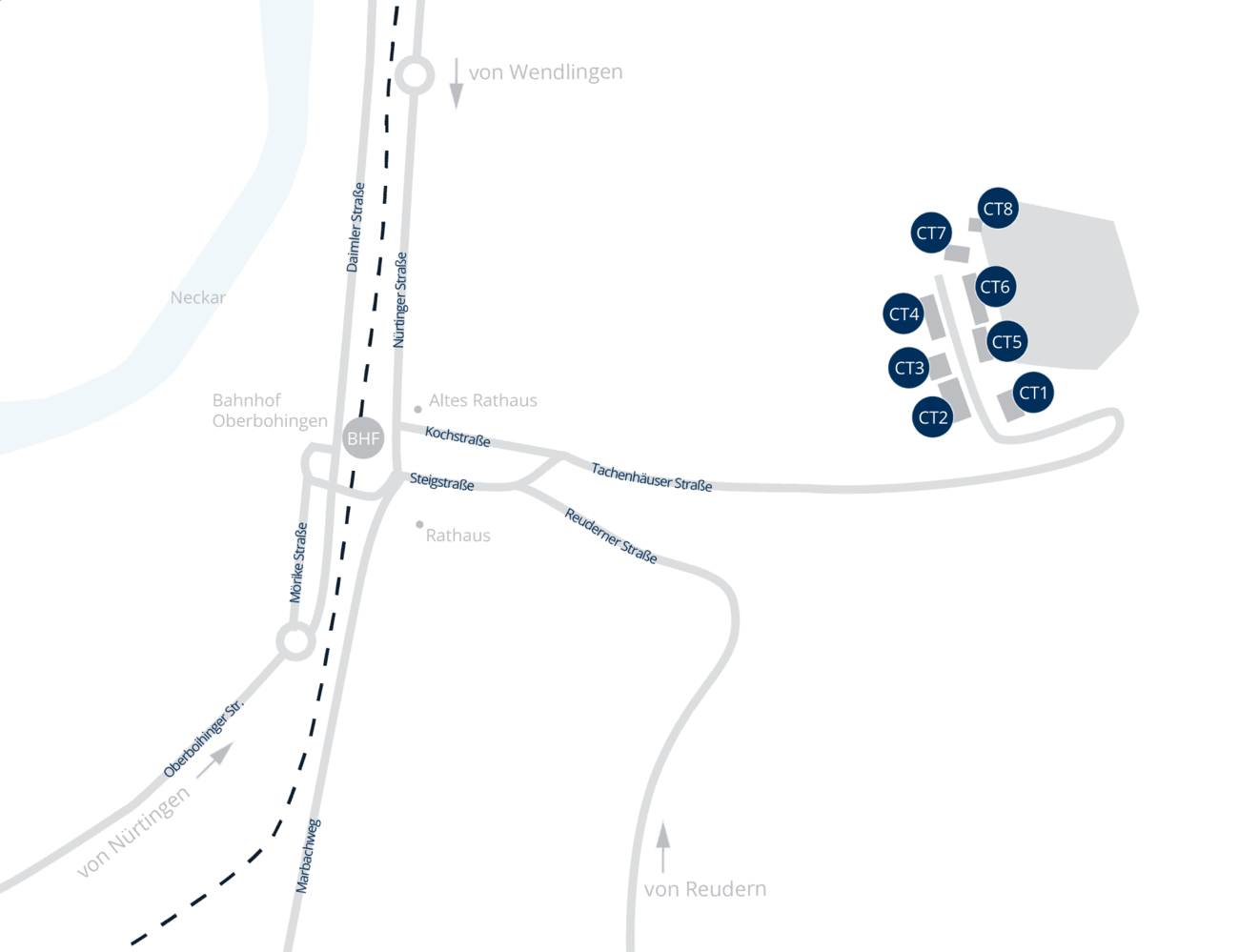 A 8 Stuttgart - München, Abfahrt Nürtingen B 313 Richtung Nürtingen. Ab Ortseingang Nürtingen Richtung Zizishausen / Oberboihingen halten. Am Ortseingang Oberboihingen, Kreisverkehr die eingeschlagene Richung beibehalten und nach etwa 50 m links abbiegen in Richung Ortsmitte. Auf der Hauptstraße bleiben, unter der Bahnlinie hindurchfahren, dann Linkskurve, Rechtskurve (am Bäcker) in Richtung Reudern. Nach ca. 50 m bergaufwärts auf der Steigstraße, links abbiegen in die Tachenhäuser Straße. Noch zwei Kilometer dieser Straße (mit einer Abzweigung nach rechts) bis zum Hofgut Tachenhausen folgen.