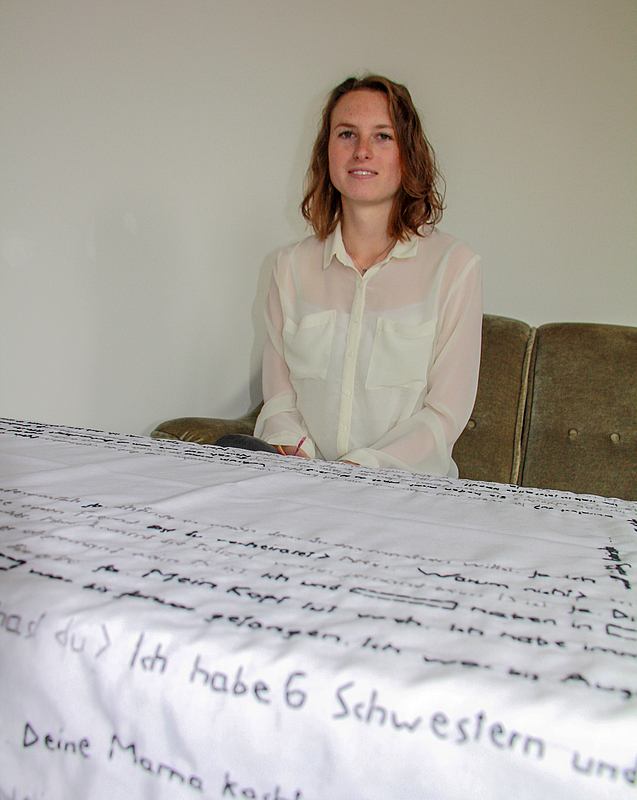 Ein wichtiger Teil der Arbeit ist für Meyle ein Tuch, auf das sie kurze Sequenzen aus den Dialogen mit den Frauen gestickt hat. Das Tuch wurde so zu einer Resonanzarbeit. Es dokumentiert als Kunstwerk nicht nur die Zusammenarbeit, sondern schärft das Wahrnehmen als Künstlerin und Kunsttherapeutin und es teilt dem Betrachter visuell erfahrbar mit, wie sich die Kommunikation zwischen den Frauen ereignet.