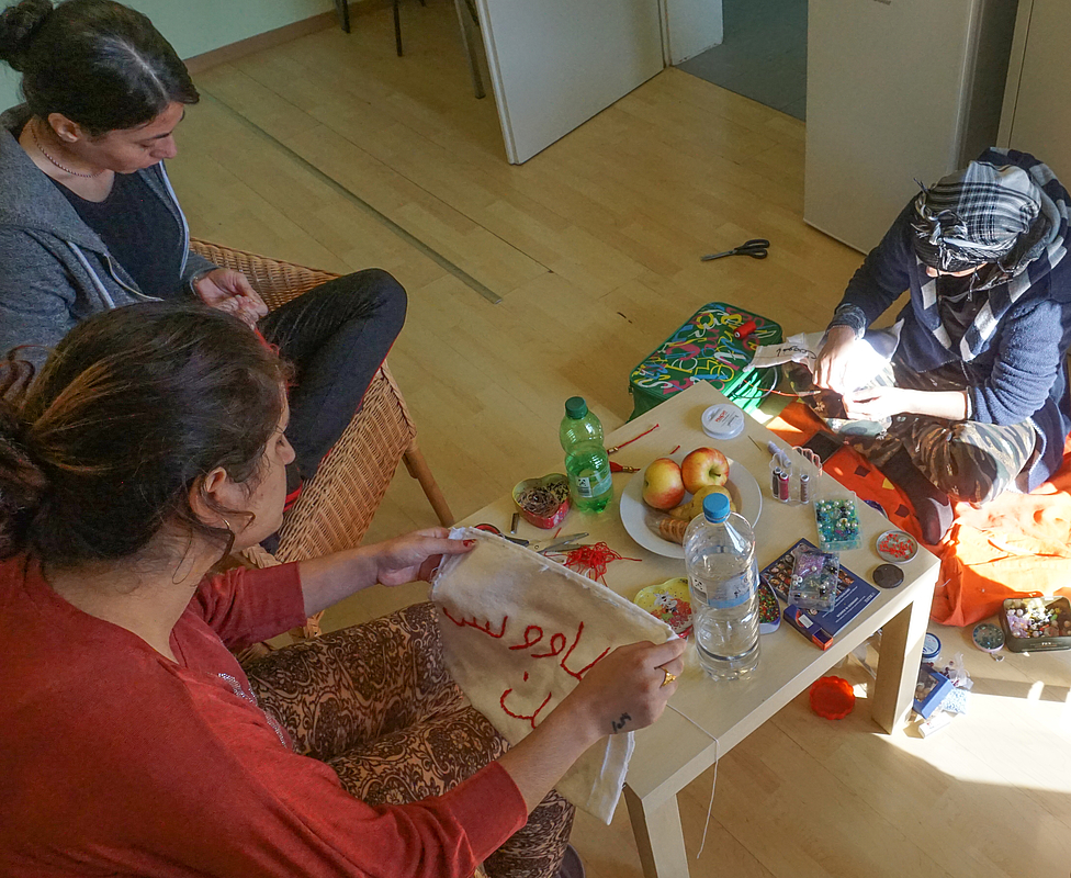 Nachdem das Frühstück weggeräumt ist liegen Stoffe und Wolle auf dem Tisch. „Das vertraute Material nimmt den Frauen die Unsicherheit. Sie können sich leichter darauf einlassen, damit zu arbeiten“, erläutert die Studentin. Der personenzentrierten Therapie entsprechend, überlässt Meyle die Themenfindung in dem Projekt den Frauen. Im Mittelpunkt steht im Hier und Jetzt zu sein, unbeschwert etwas zu tun, nicht das Ergebnis. Entstanden sind bisher Vorhänge für die Gemeinschaftsunterkunft, Waschlappen und Häkelarbeiten, mit Buchstabenstempeln werden Stoffe bedruckt, so wächst nebenbei der Deutsch-Wortschatz.