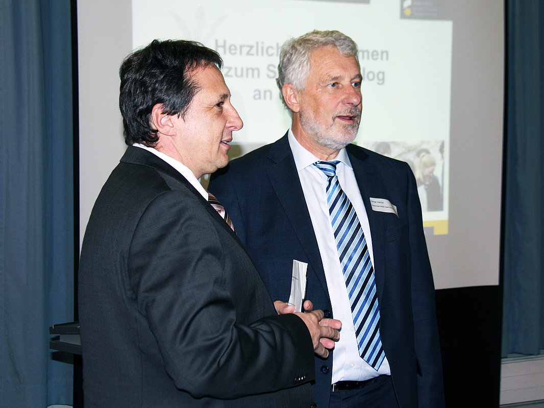 Hausherr Prof. Dr. Andreas Frey (l.) und Gastgeber Otmar Heirich im Gespräch beim "Standortdialog". (Foto hfwu/renner)