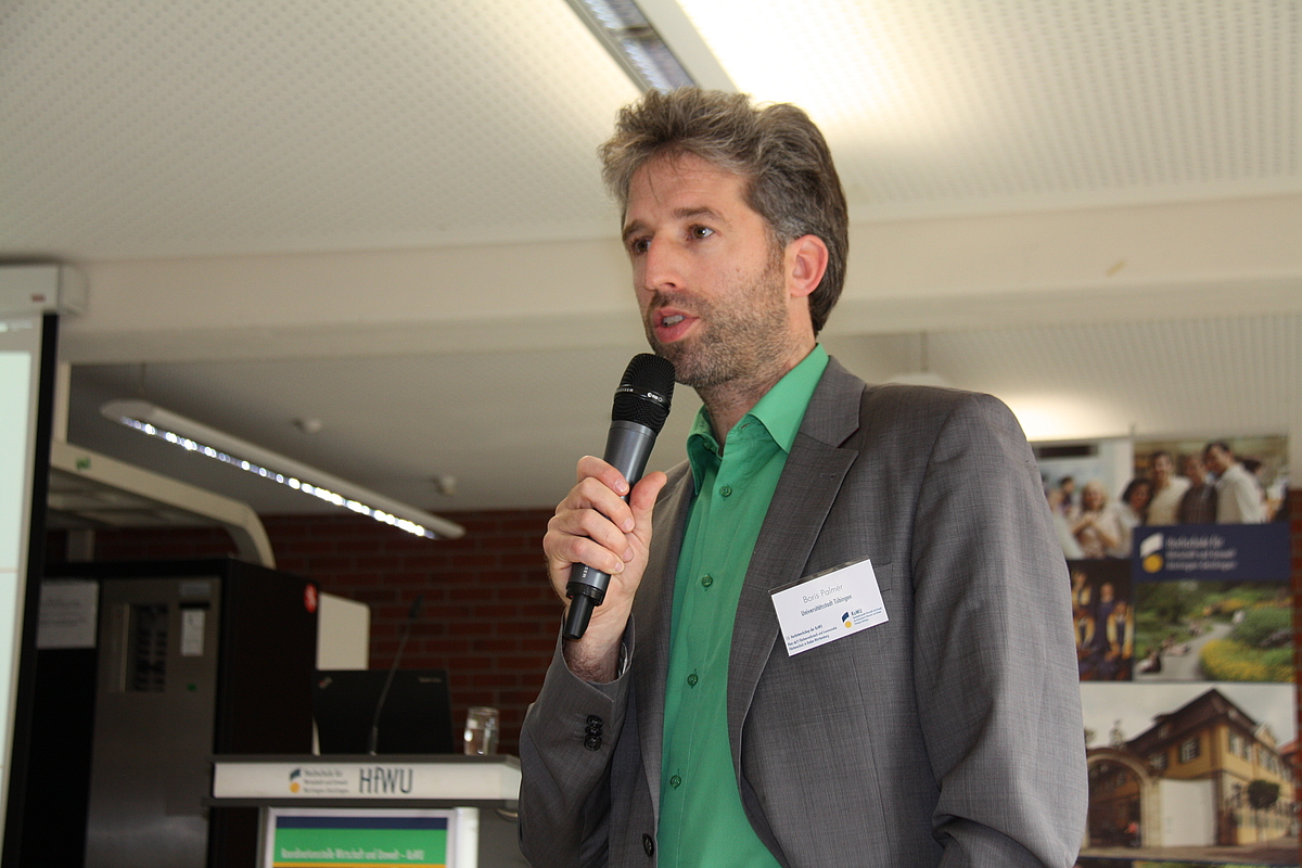 Nach den politischen Konzepten standen konkrete Beispiele, wie der Flächenverbrauch in der Praxis reduziert werden kann, auf dem Programm. Experten der HfWU zeigten mögliche neue Nutzungsformen von militärischen Groß- und von Gewerbeflächen. Zudem stellte ein Vertreter der Stuttgarter Akademie der Künste das „Reallabor Spacesharing“ vor, ein Konzept zur effektiveren Nutzung von Gebäuden im städtischen Raum. Die Tagung endete mit Workshops und einer Abschlussdiskussion. Zu der öffentlichen Veranstaltung waren rund hundert Experten aus Ökonomie, Umweltschutz und Raumplanung an die HfWU nach Nürtingen gekommen. Organisiert wurde die Veranstaltung von der HfWU-Koordinationsstelle Wirtschaft und Umwelt (KoWu) unter Leitung von Prof. Dr. Christian Arndt.