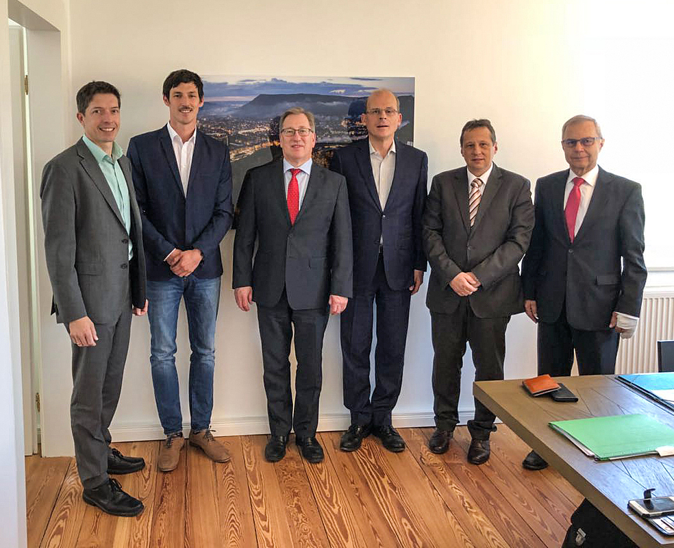G-INNO-Zusammenarbeit besiegelt (von links): Klaus Meissner (Vorstandsmitglied der KSK Göppingen), Geschäftsführer Daniel Hammer, Hubert Rinklin (Vorstandsvorsitzender des Albwerks), Dr. Hariolf Teufel (Vorstandsvorsitzender der KSK Göppingen), HfWU-Rektor Prof. Dr. Andreas Frey und Holger Scheible (Vorsitzender des Aufsichtsrats des Albwerks)