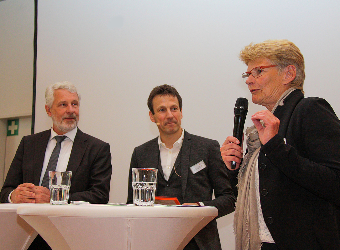 HfWU-Professor Dr. Dirk Funck (Mitte) im Gespräch mit Otmar Heirich und Angelika Matt-Heidecker.