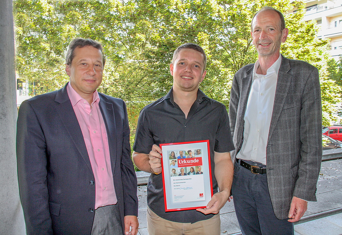 Im Namen der DKMS übereichten HfWU-Rektor Prof. Dr. Andreas Frey und Studiendekan Prof. Dr. Gerhard Mauch am Geislinger Standort der Hochschule die Ehrenurkunde an den Wirtschaftsrecht-Studenten und bedankten sich für sein Engagement. Als Stammzellspender zur Verfügung zu stehen, ist für Nico Mareck eine Selbstverständlichkeit. Er hat sich bereits mit 18 registrieren lassen.
