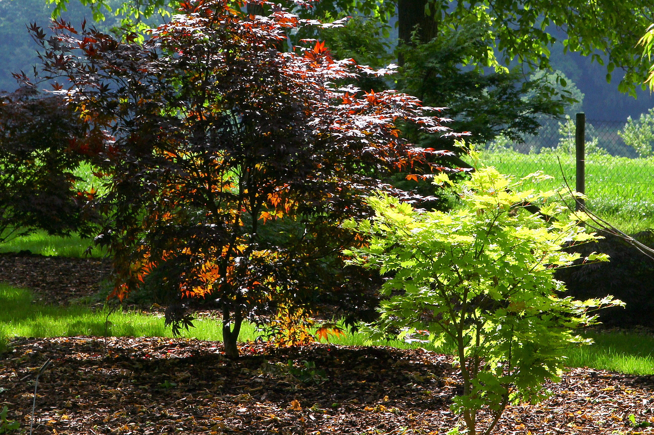 Im südlichen Teil des Gartens, in der Nähe der Walnussbaumreihe befindet sich ein kleines Sortiment an unterschiedlichen Fächerahorn Sorten. Es ist unterpflanzt mit einer selbstgezogenen, sehr langlebigen Primelart, der Karnevalsprimel (Primula vulgaris ssp. sibthorpii), dem Buschwindröschen (Anemone nemorosa) und dem Frühlingsalpenveilchen (Cyclamen coum).