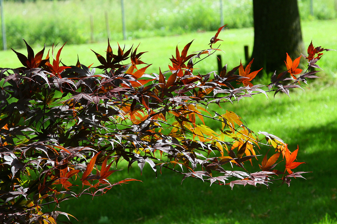 Der Fächerahorn (Acer palmatum) kommt aus dem fernen Osten, aus Japan und Korea. Er wächst dort sowohl in den Wäldern der Berge, al auch des Tieflandes. Er bevorzugt den lichten Schatten in windgeschützten Lagen auf frischen bis feuchten und humosen Lehmböden. Sein Wuchs und das Laub läßt sofort erkennen, dass er nicht in unseren Breiten beheimatet ist. Er wirkt besonders, apart, grazil.