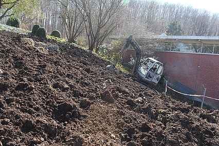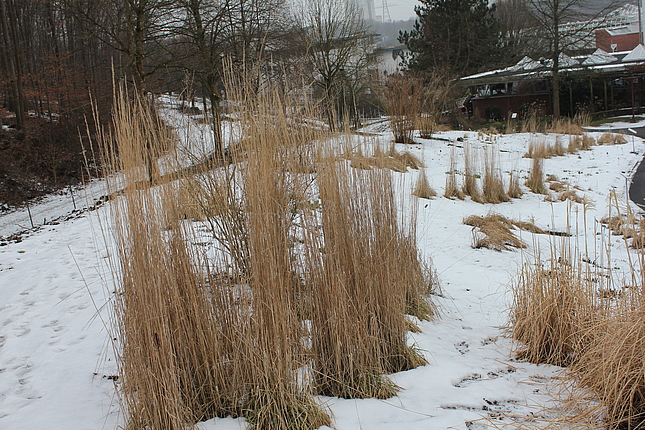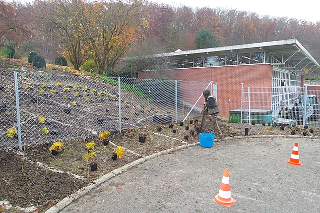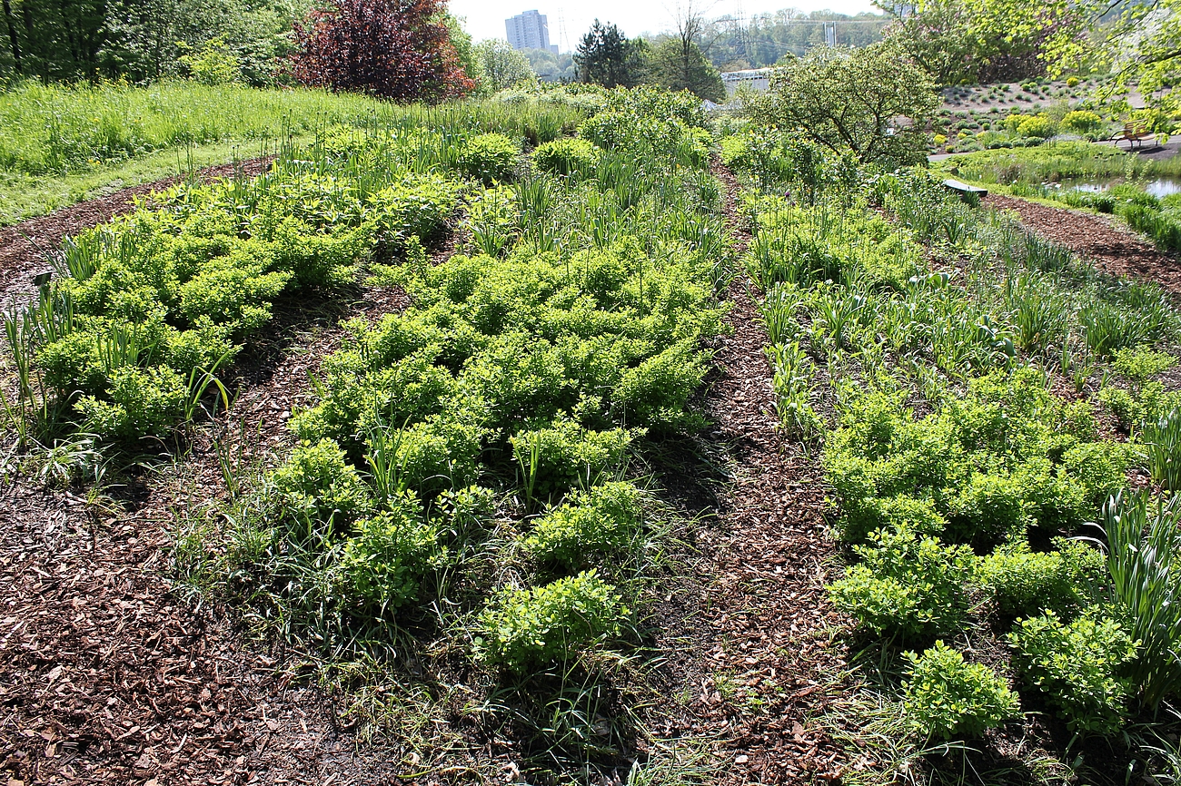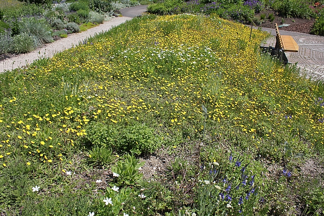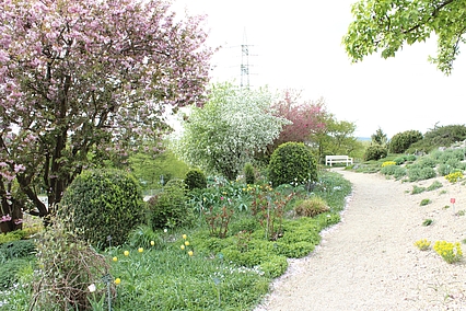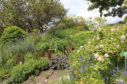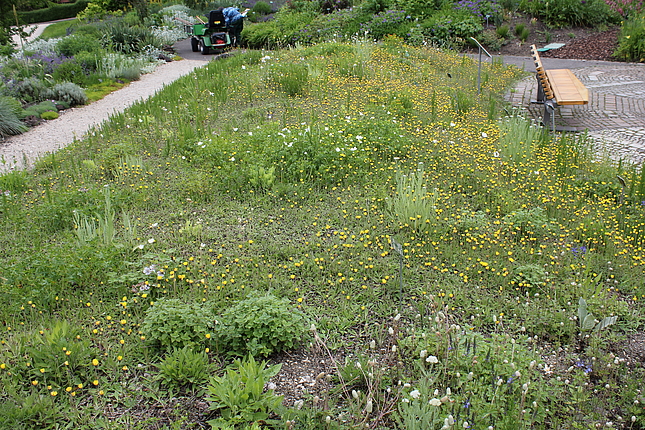 Auf dem dahinter liegenden Hügel entsteht demnächst eine Staudenmischpflanzung in Verbindung mit Rosen. Hier wird beobachtet, welche bodendeckenden Staudenarten sich in geeigneter Weise mit Strauchrosen kombinieren lassen. Auch diese Mischpflanzung wird einen einfachen Charakter haben und sehr pflegeextensiv sein. Durch die Rosen wirkt sie aber auf jeden Fall farbenprächtig und lange.