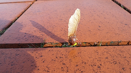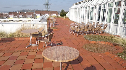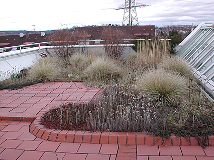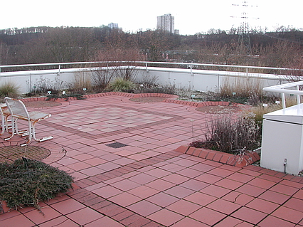 Begehbar  und als Dachterrasse mit Pflanzflächen ausgebildet ist nur das sogenannte "Westdach". Die roten Klinker, mit denen es belegt ist, nehmen den Farbton der Klinkerfassaden des Gebäudes auf.