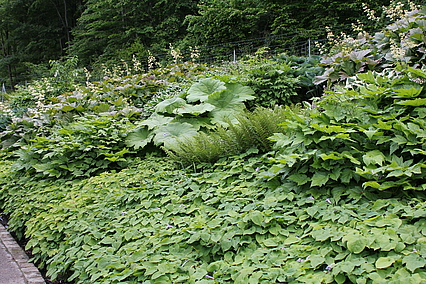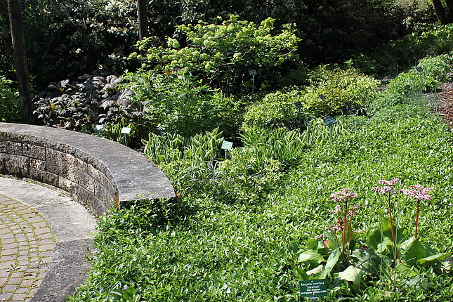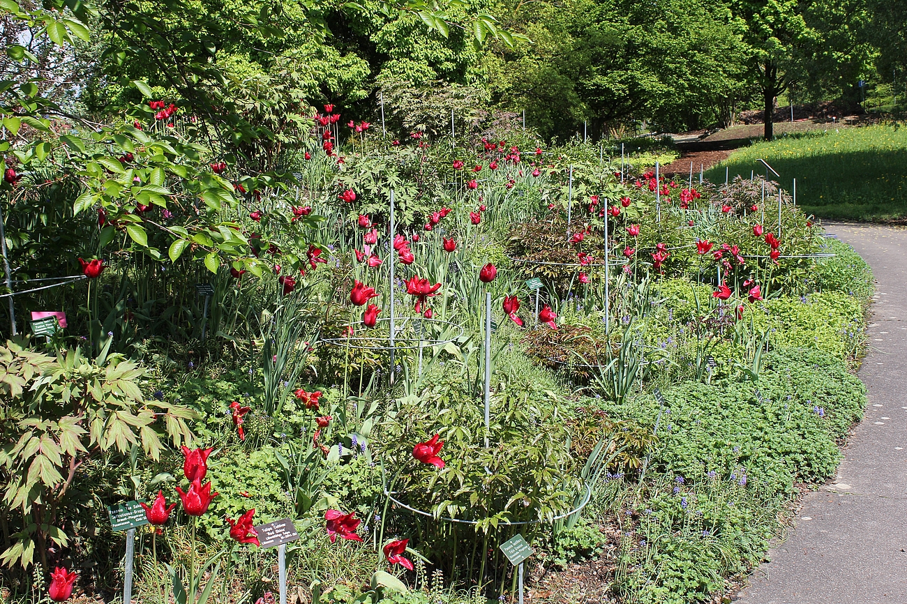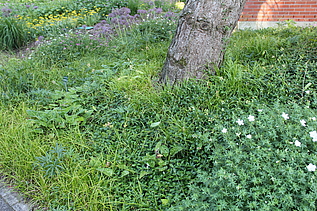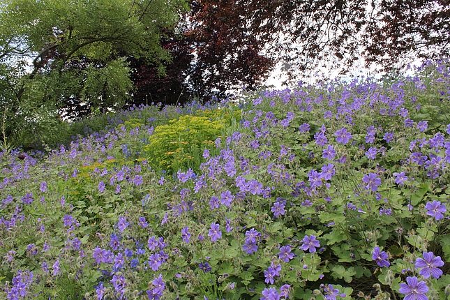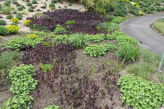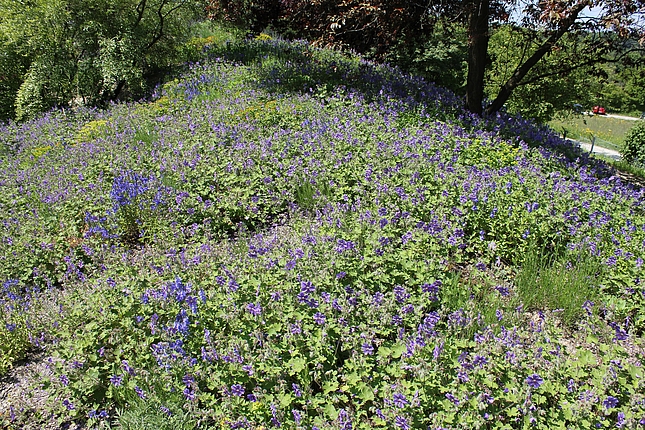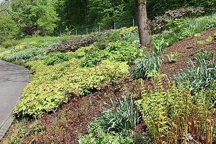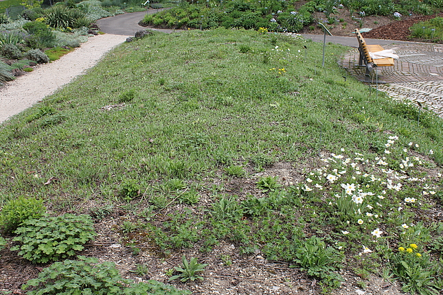 Pfingstrosen finden hier - eher ungewöhnlich - in einer Streupflanzung Verwendung. Sie werden in eine Matrix aus bodendeckenden Stauden locker eingestreut. Diese Matrix wurde nicht wie üblich aus einer Staudenart gestaltet, sondern aus Bändern verschiedener Arten, die vom Mittelpunkt des Hügels hinab zum Weg verlaufen. Diese Bodendecker sind relativ robust und wüchsig. Auch die Pfingstrosen haben zwar ausgesprochen prächtige Blüten, sind aber im Grunde sehr pflegeleicht. So ist das Ziel, eine prachtvolle und gleichzeitg pflegeextensive Staudenpflanzung zu entwickeln.