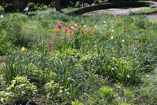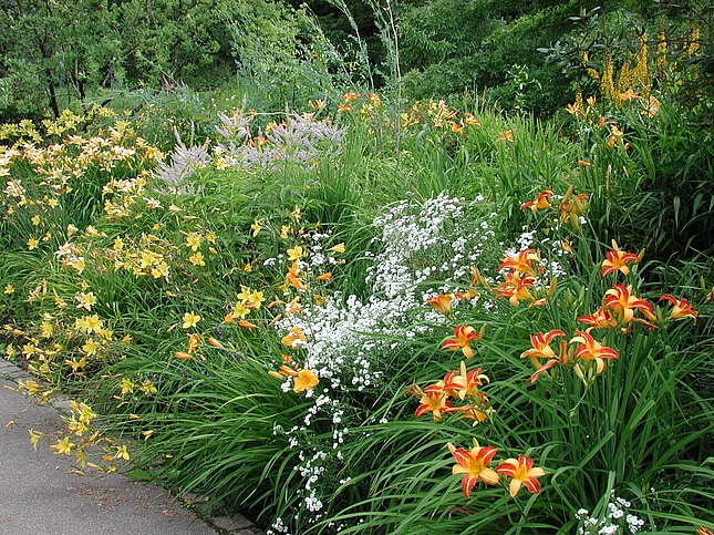 Die Taglilien werden in diesem Bereich mit Stauden unterschiedlicher Ausbreitungsstrategien kombiniert. Als erstes entstand  die Kombination mit wuchsstarken wuchernden Arten direkt neben dem Bachlauf. In den nächsten Jahren werden Kombinationen mit wuchsstarken horstig wachsenden Arten endstehen und Kombinationen mit Arten, die eher konkurrenzschwach sind.