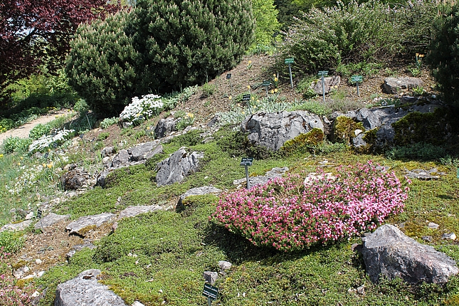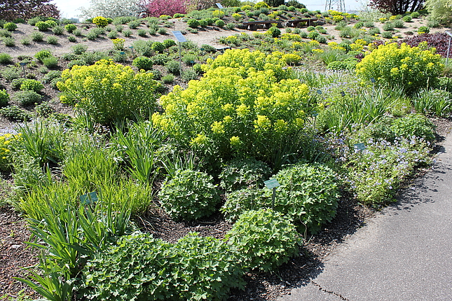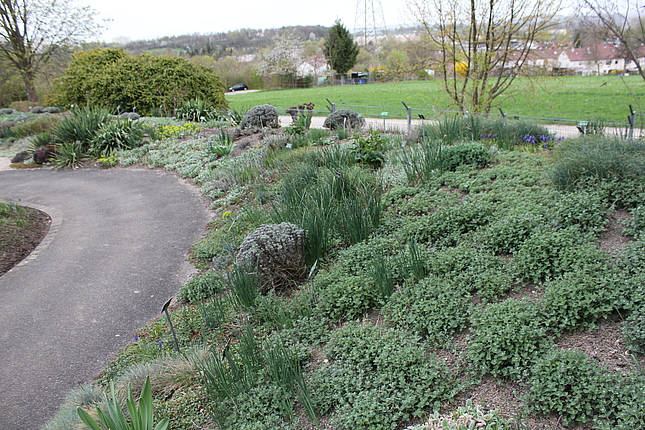 Außerhalb des Staudengartens ist links des Weges zur Mensa der Naturwerkstein-Lehrpfad zu finden. Hier werden die im Landschaftsbau gängigen Natursteine in ihrer Be- und Verarbeitung gezeigt.
