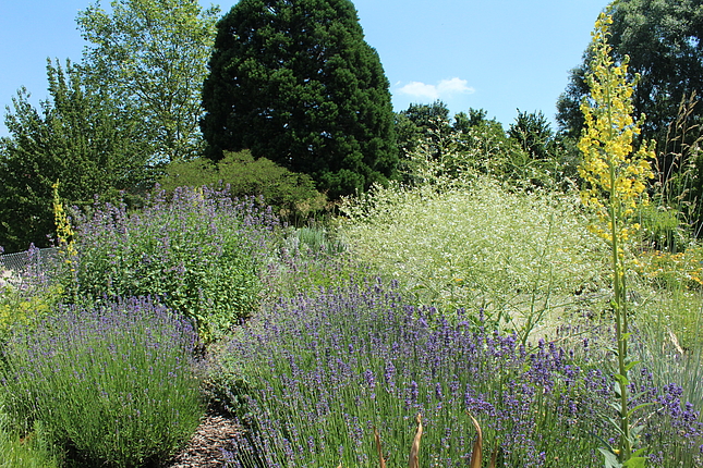 Diese Pflanzung ist geprägt durch verschiedenste Stauden und Kleingehölze mit grauem, filzigen, graublauen und/oder graugrünem Laub. Sie wird zu einer Leitstaudenpflanzung entwickelt.