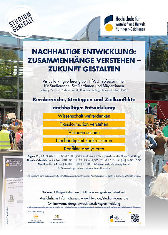 In einer Ringvorlesung werden durch ausgewählte Beiträge von Professor*innen aller Fakultäten ein faszinierendes Basiswissen zu nachhaltiger Entwicklung vermittelt. Experten aus verschiedenen Bereichen zeigen das Thema nachhaltige Entwicklung in seinem gesamten Facettenreichtum auf. Mit welchen Strategien können wir nachhaltige Entwicklung fördern? Bei uns und weltweit? Zwischen welchen Sustainable Development Goals (SDGs) bestehen Zielkonflikte? Und wenn ja, welches Ziel sollten wir zuerst angehen? Die Veranstaltung richtet sich auch ausdrücklich an Schüler und Nachhaltigkeitsinteressierte im Umfeld der HfWU. Der Abschluss der Ringvorlesung findet im Rahmen einer Nachhaltigkeits-Expo, der HfWU-NEXPO, statt. Diese dient als gemeinsame Veranstaltung zur Vorstellung und Diskussion der erarbeiteten Ergebnisse.