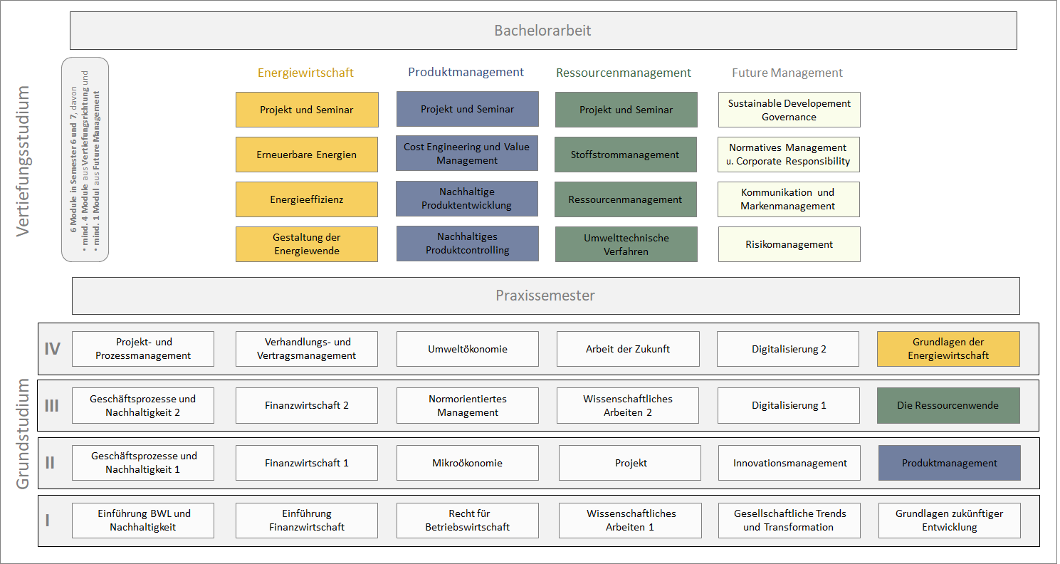 Das Studium macht die Zusammenhänge zwischen betriebswirtschaftlichen, technischen und rechtlichen Strukturen und Prozessen in Unternehmen der produzierenden und verarbeitenden Industrie sowie in dienstleistenden Einrichtungen oder Verwaltungen deutlich. Die Themen Nachhaltigkeit und BWL sind dabei der rote Faden, der sich durch das komplette Studium zieht und als Basis und Bezugspunkt in alle Schwerpunkte einfließt.
