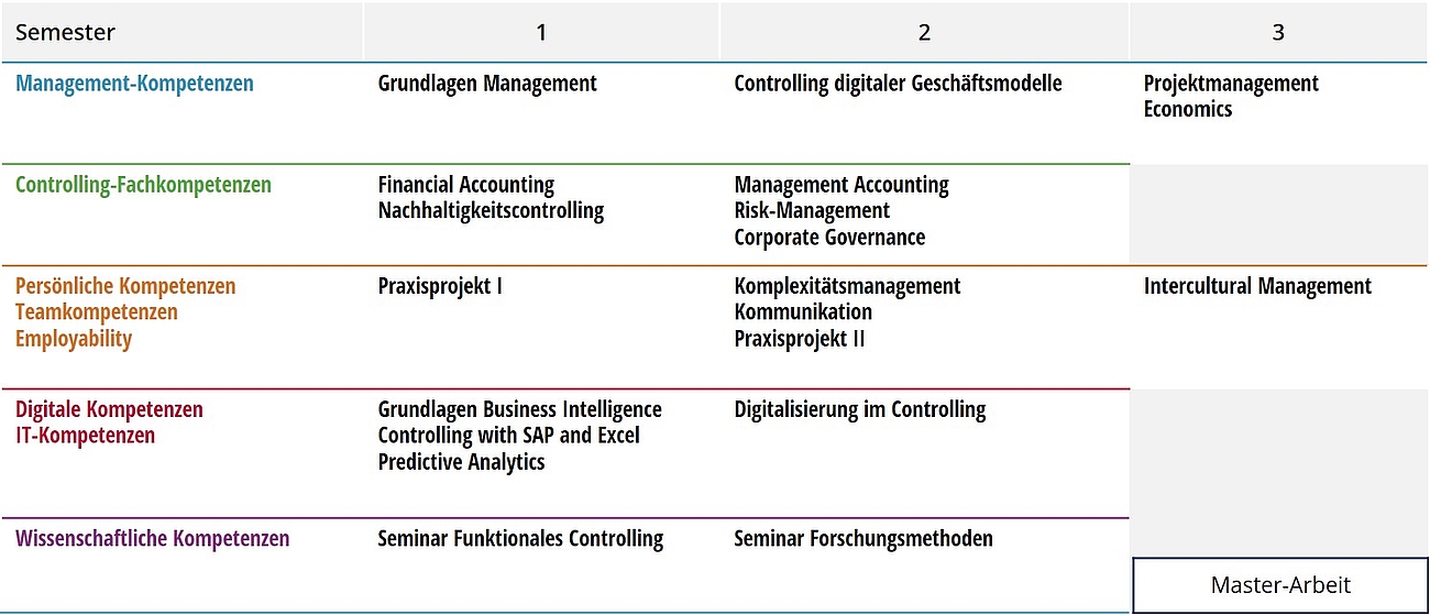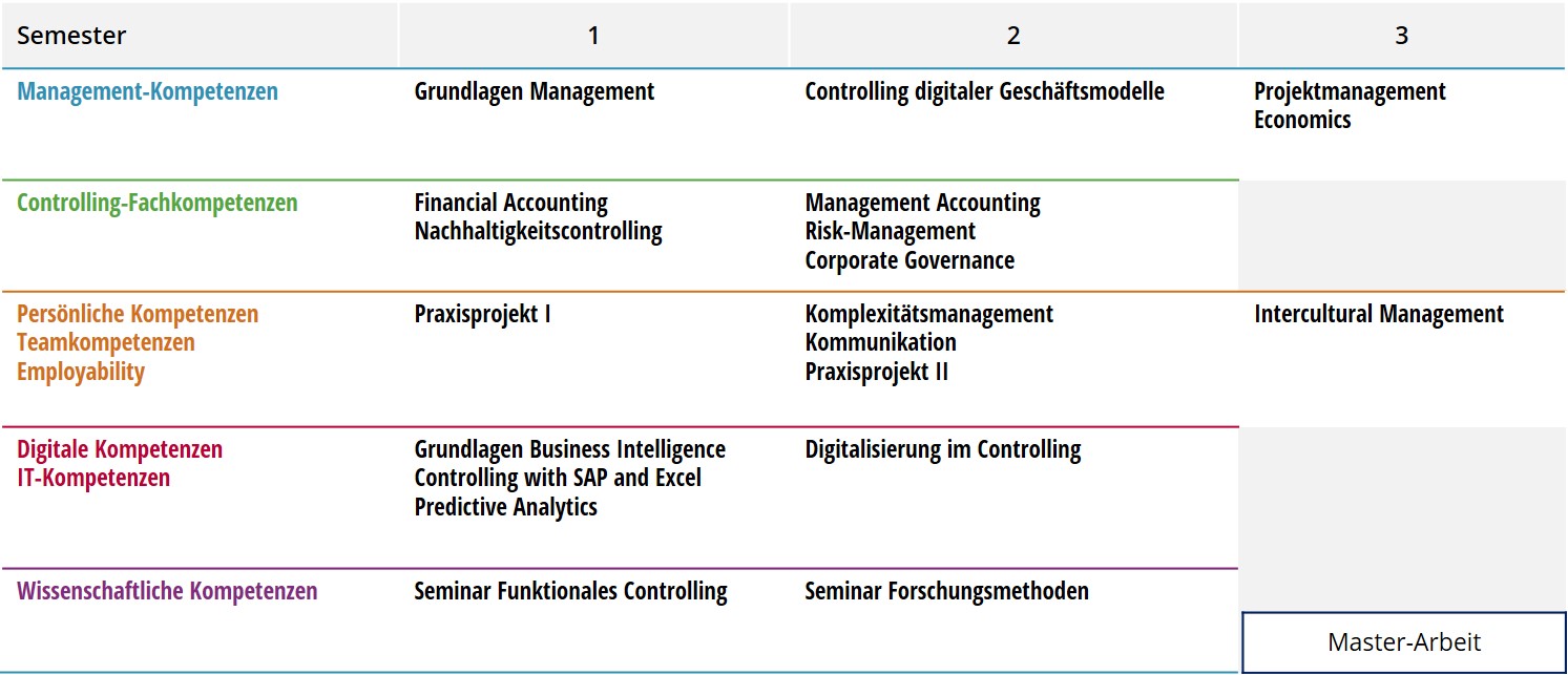 Die Kompetenzziele sind aus den Anforderungen der Praxis abgeleitet und angelehnt an das Berufsbild der größten berufsständischen Controller-Vereinigung in Europa, dem Internationalen Controller Verein. Zudem verfügen sämtliche Dozenten über eine mehrjährige Berufspraxis. In den ersten beiden Semestern wird jeweils, gemeinsam mit einem Unternehmen, ein Praxisprojekt bearbeitet. Das Studium wird ergänzt um Gastvorträge und Kamingespräche mit Top-Managern und Controllern. Zudem finden Exkursionen zu Unternehmen statt ebenso wie der Besuch einer Controlling-Konferenz.