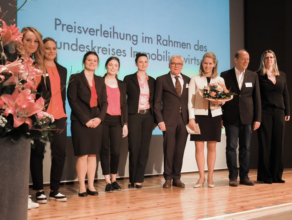 Ursula Hartenberger, die ebenfalls für die RICS in Brüssel die globale Nachhaltigkeitsstrategie verantwortet, versuchte den Dreiklang wohnen, leben, arbeiten in Einklang zu bringen. Nachhaltigkeit sei auch für die Immobilienpraxis das Gebot der Stunde, dem sie sich seit 20 Jahren widmen würde. Die Ziele der Vereinten Nationen fänden sich auch in den RICS Zielen wieder. Bereits seit 2006 seien alle Mitglieder des Verbandes auf diese verpflichtet und müssten entsprechende Nachweise erbringen. Doch es müsste nach wie vor das „Silodenken“ aufgebrochen werden. Noch immer würde auch Nachhaltigkeit nach ihrem „Wert“ beurteilt. „Wir müssen hier umdenken. Wert bezeichnet das Gestern, Nachhaltigkeit ist in die Zukunft gerichtet.“ Dass auch Bildung einen nachhaltigen Wert besitzt, betonte Ehrensenator Herbert Klingohr. Der Freundeskreis Immobilienwirtschaft unterstützt den gleichnamigen HfWU-Studiengang, unter anderem mit Preisen. Nadja Mauch erhielt während des Tages der Immobilie den Allianz Förderpreis für ihre Bachelorarbeit.