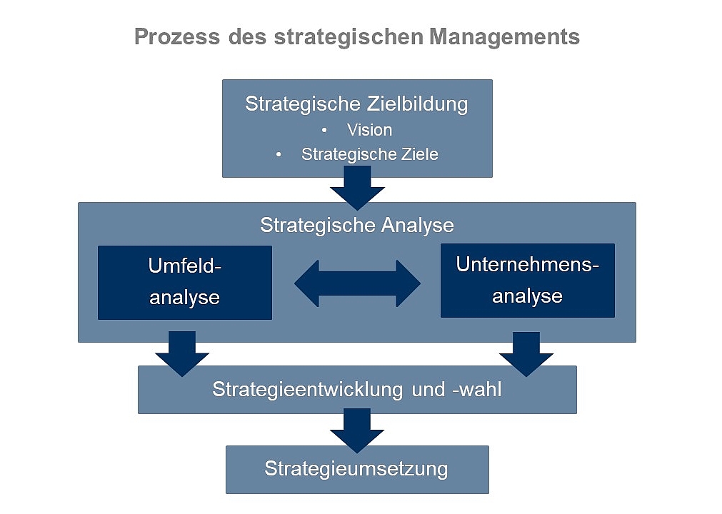 Durch die permanenten gesellschaftlichen Veränderungen ist es für Unternehmen unerlässlich, ihre strategischen Ansätze laufend den neuen Anforderungen anzupassen. Nur so können sie wettbewerbsfähig bleiben und langfristig ihren Erfolg sichern. Du wirst daher bei uns lernen, wie man flexible und anpassungsfähige Strategien entwickelt, die auf Innovation, Nachhaltigkeit und sozialer Verantwortung basieren. Zudem zeigen wir Dir, wie Unternehmen die konkrete Erreichung ihrer Ziele überwachen, um sicherzustellen dass sie auch weiterhin auf Kurs bleiben. Die Entwicklung der Strategie erfolgt dabei im Prozess des strategischen Managements, das in den Phasen strategische Zielbildung, strategische Analyse, Strategieentwicklung und Strategiewahl sowie Strategieumsetzung abläuft.