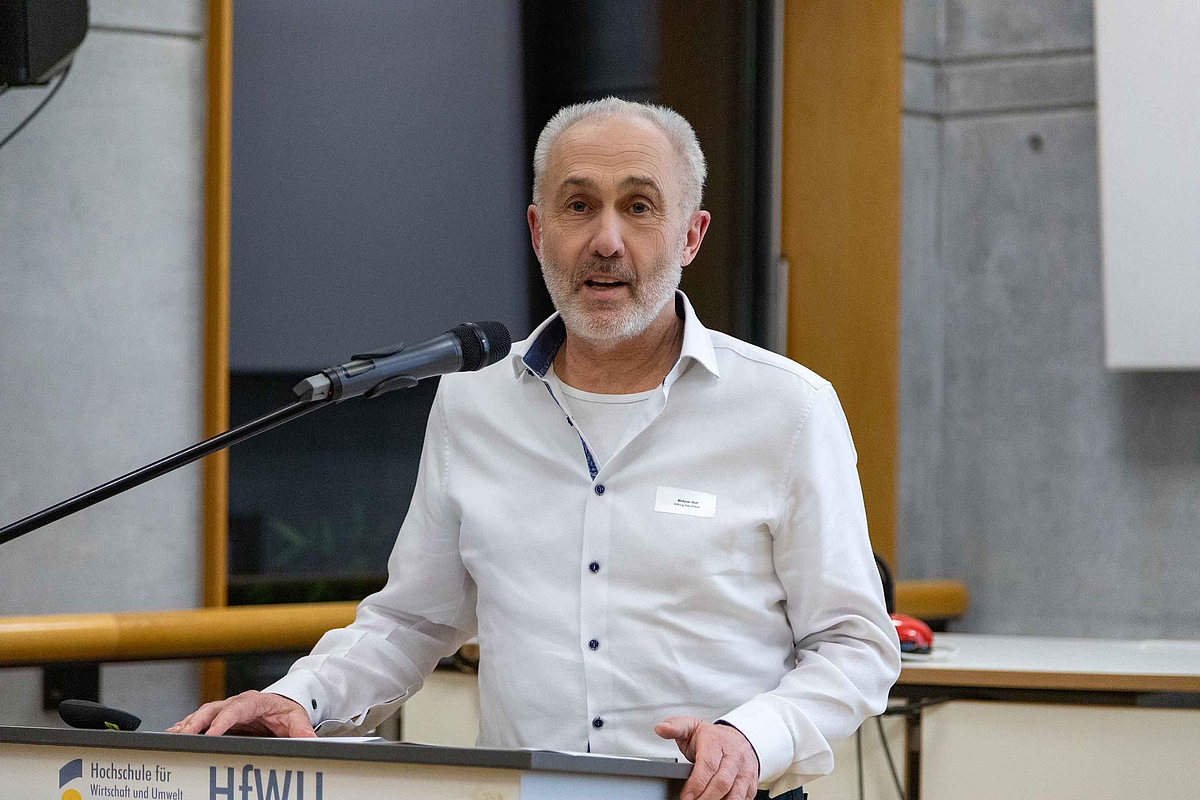 Rolf Mößmer, HfWU-Absolvent, Geschäftsführer der am-Computersysteme GmbH und Gründer der Stiftung NaturRaum, gab in seiner Ansprache einen persönlichen Einblick in seinen Werdegang, angefangen beim Schulbesuch in Geislingen bis hin zum erfolgreichen IT-Unternehmer. „Das Thema Nachhaltigkeit hat mich schon immer umgetrieben“, so Mößmer. Eine der ersten Aktionen bei der Errichtung eines eigenen Firmengebäudes vor mehr als 20 Jahren sei gewesen, Photovoltaik-Anlagen auf dem Firmengebäude zu installieren. In einem spannenden Vortrag zeichnete er die Entwicklung der IT in den vergangenen 40 Jahren nach und welche Herausforderungen die Gründung eines Unternehmens in diesem Geschäftsfeld mit sich brachte. Zudem stellte er die weite Spanne der Arbeit seiner Stiftung vor, die vom Artenschutz und der biologischen Vielfalt bis hin zur Initiative Bildung für nachhaltige Entwicklung und zur Umweltpädagogik reicht.