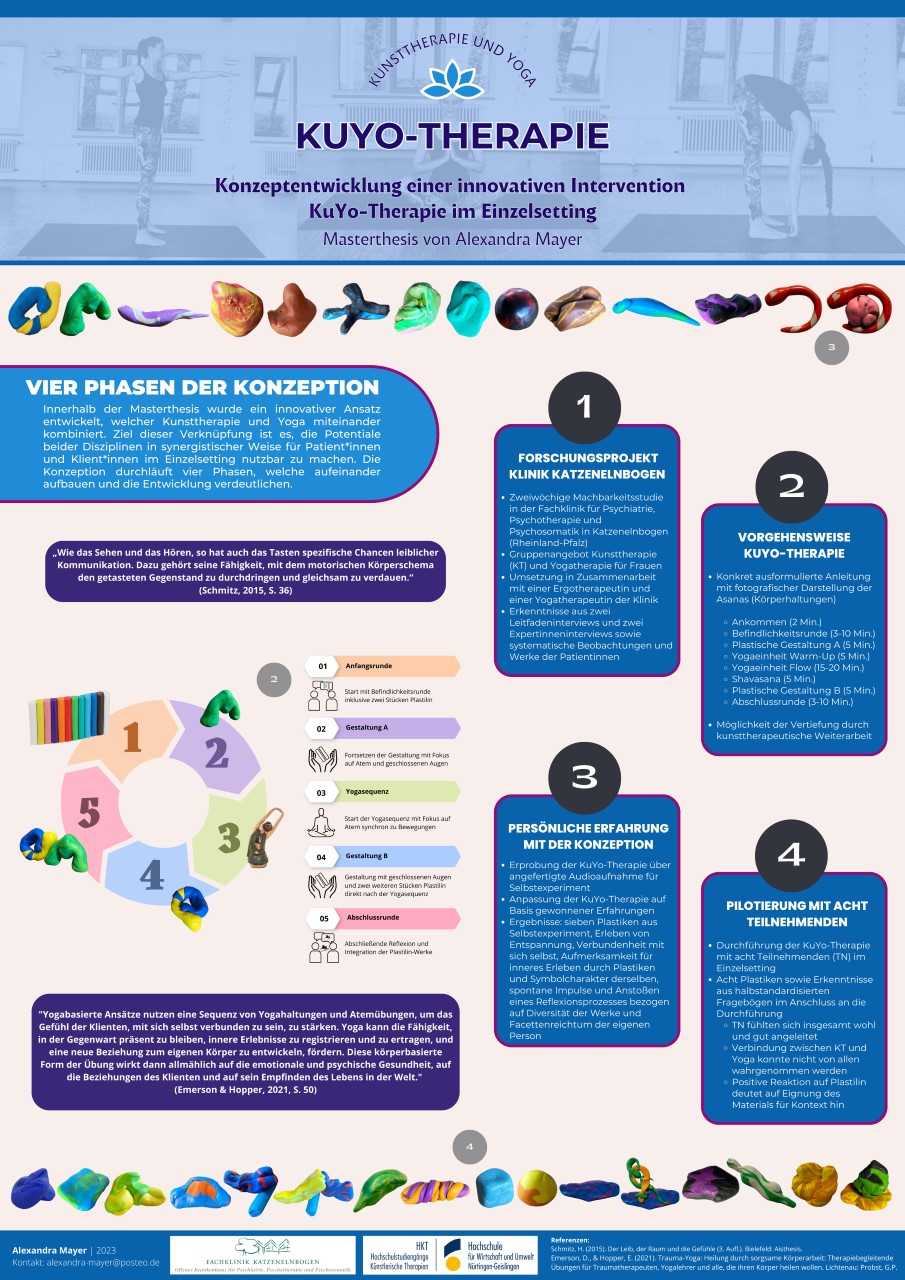 Im Rahmen dieser Mixed-Methods-Studie (QUAL + QUAN) wurden Kunsttherapeut*innen mit langjähriger (mind. 4 J.) Berufserfahrung befragt (n=4). Die Datenerhebung erfolgte durch strukturierte Expert*inneninterviews sowie einem studienspezifisch entwickelten und pilotierten Fragebogens über einen Zeitraum von 7 Monaten. Die Auswertung erfolgte anhand der qualitativen Inhaltsanalyse (nach Mayring) sowie deskriptiver Analysen von Häufigkeiten und Zusammenhängen durch Chi-Quadrat-Unabhängigkeitstest und Spearman-Rangkorrelations- koeffizient.