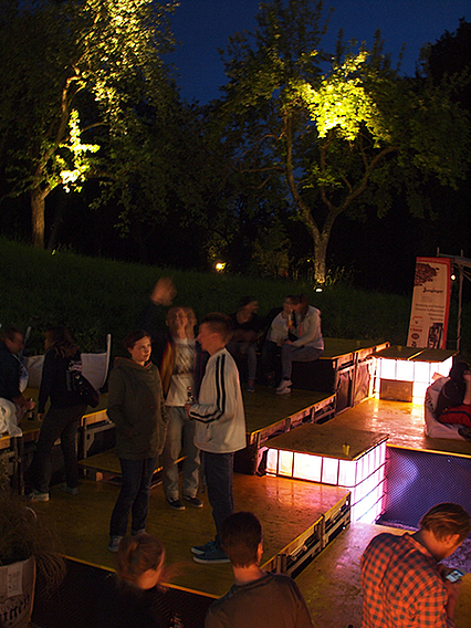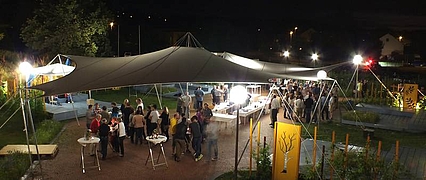 Das Projekt "Raum auf Zeit - Zeit für Raum" wurde mit einem festlichen Abschlussabend gefeiert. Zum Buffet gab es Live-Musik und der Campus wurde durch eine Lichtinstallation in Szene gesetzt. Den krönenden Abschluss des Abends bildete ein großes Feuerwerk mit Musikuntermalung.