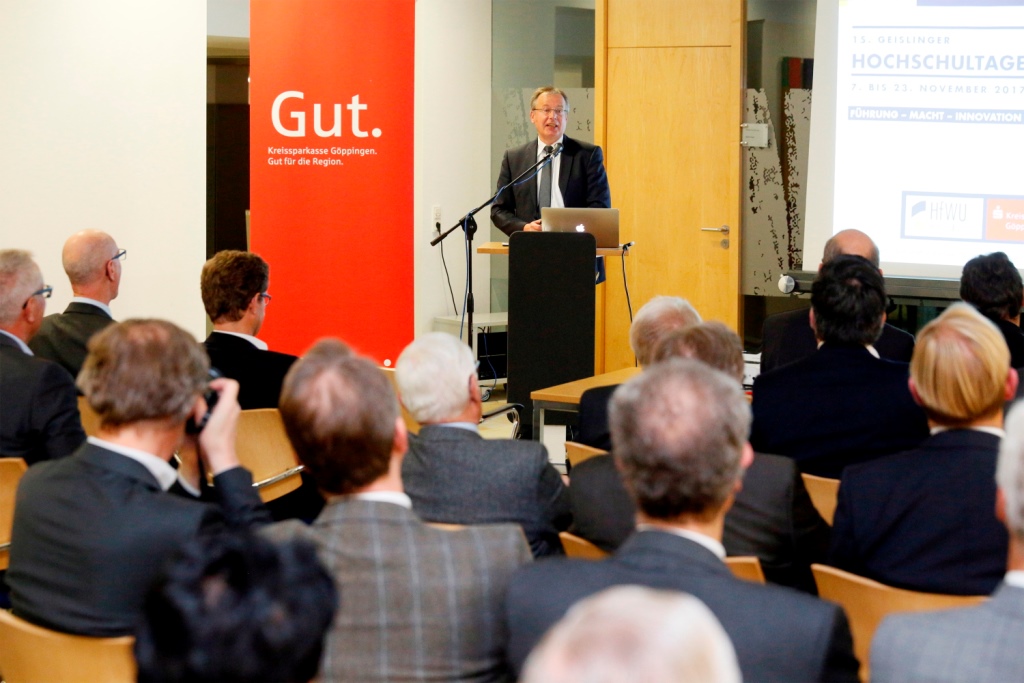 NÜRTINGEN (hfwu). Die 15. Geislinger Hochschultage sind gestern Abend mit dem Thema Führung – Macht – Innovation gestartet. Der Masterstudiengang Unternehmensführung hatte in diesem Jahr die thematische Ausrichtung übernommen. Der Prorektor der Hochschule für Wirtschaft und Umwelt, Professor Dr. Valentin Schackmann, hielt den Eröffnungsvortrag.