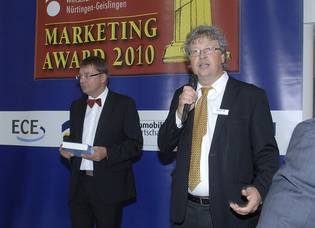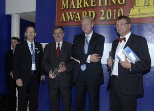 Gewinner des Awards in der Kategorie Wohnimmobilien Sigfried Gallitschke (2. v.l.), Marketing-Leiter und Peter Stubbe (3.v.l.), Geschaftsführer der Leipziger Wohnungs- und Baugesellschaft mbH, Laudator Klaus Striebich (1.v.l.) von der ECE und Prof. Stephan Kippes (rechts)